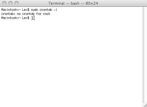 Re-type "sudo crontab -1" (minus the quotes) to make sure that the delete process worked. If it did, you should see "crontab: no crontab for root".